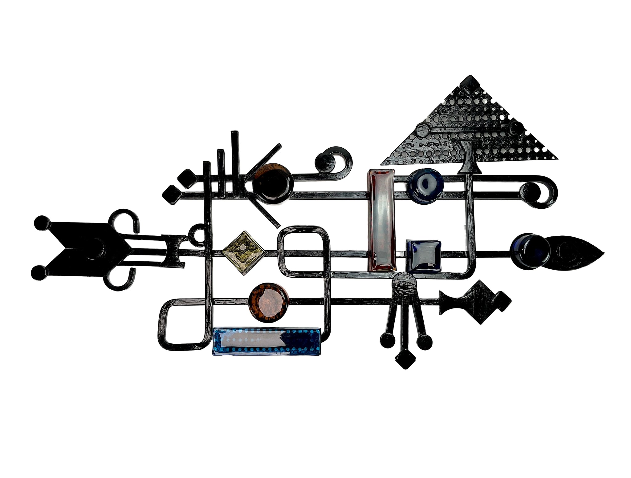Originally intended as an exterior architectural feature for 1960s-70s properties, this piece is now most commonly and effectively displayed as a dramatic interior wall decoration, adding a powerful sculptural statement to any space. The deep black iron has been professionally repainted, restoring its dramatic presence, while the coloured glass elements remain in their original condition, creating a captivating play of light and texture.